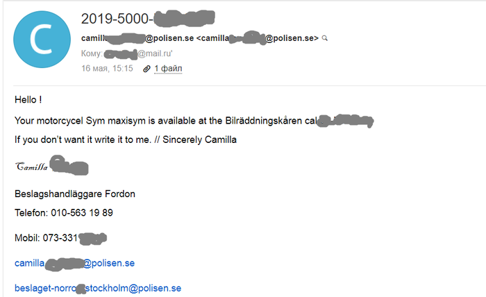 В общем, бравая полиция обнаружила оставленный мот с проколотым колесом где-то на улицах столицы.И был прикреплённый PDF с детальной информацией. Его я должен показать при получении мопеда. В нём же указано, что у меня есть ровно 30 дней со дня получения уведомления, чтобы его забрать, иначе утилизируют. Потом прислали ещё несколько всяких документов, включая бланк для того, чтобы мот забрало доверенное лицо.А затем получил фотки от знакомых из СтокогольмаФото 1: попытка завести без ключа