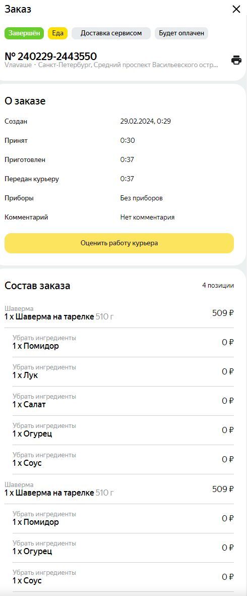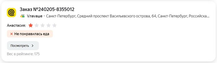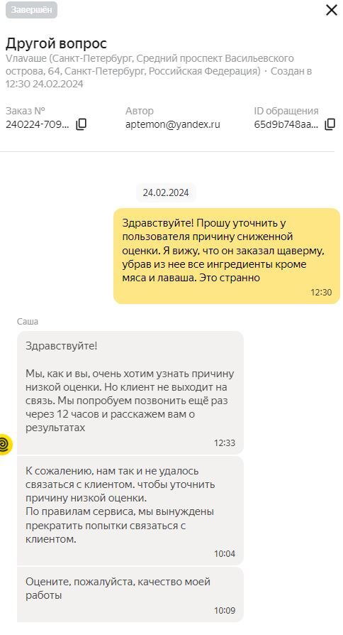 Как-то утром я, как обычно, зашел в ЛК и обнаружил отзыв на 1 звезду =( Сразу написал в техподдержку агрегатора, чтобы они связались с клиентом и выяснили, в чем причина низкой оценки. Они ответили, что клиент не получил заказ…