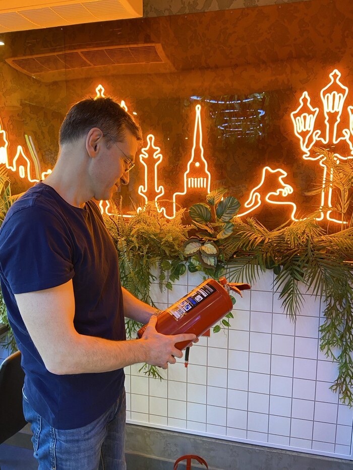 У меня на точке все огнетушители стояли новые. Я беру провинившийся огнетушитель в руки и понимаю, что он пустой. Он легкий, вообще ничего не весит, и чеки нет! Т.е. кто-то его использовал, но где и когда!?. Если бы это произошло в зале, мы бы точно заметили)