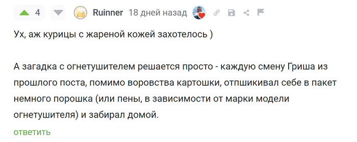 А шаверму за самый интересный вариант объяснения таинственного опустошения огнетушителя получает @Ruinner. Мне понравились юмор и внимательность читателя)