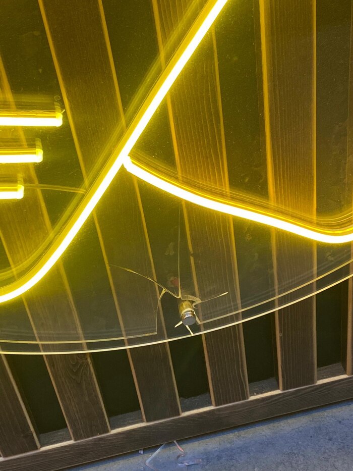 Еще я сразу обратил внимание, что вывеска как-будто не очень яркая, но подумал, что в солнечный день это нормально. Только спустя какое-то время я понял, что вывеска вообще не светится наружу, свет направлен только в стену (на фото видно), что учитывая черную подложку практически незаметно .
