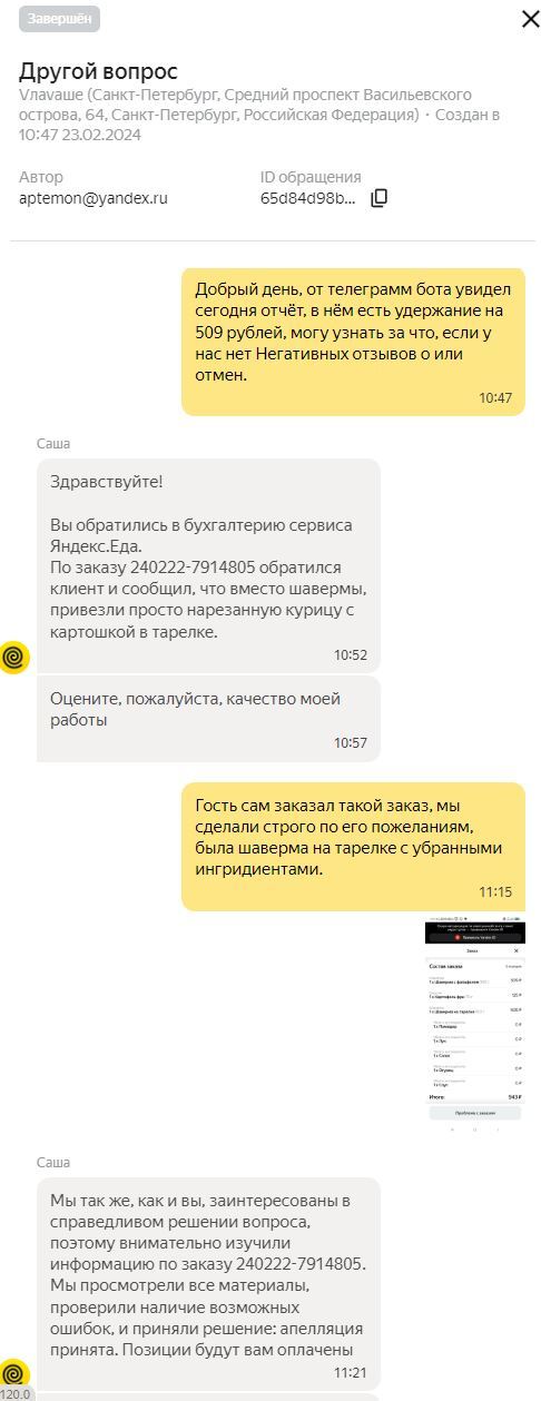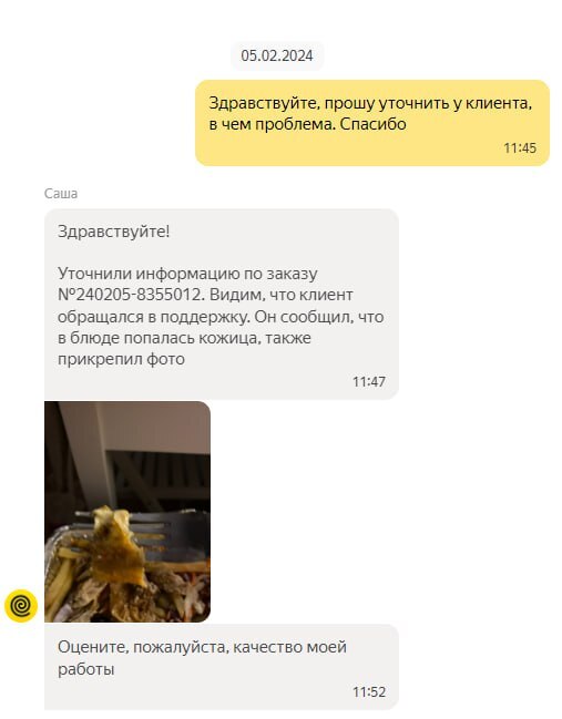 Оказывается «в блюде попалась кожица», что послужило причиной обращения в службу поддержки Яндекса с жалобой. Даже фото прикрепили…