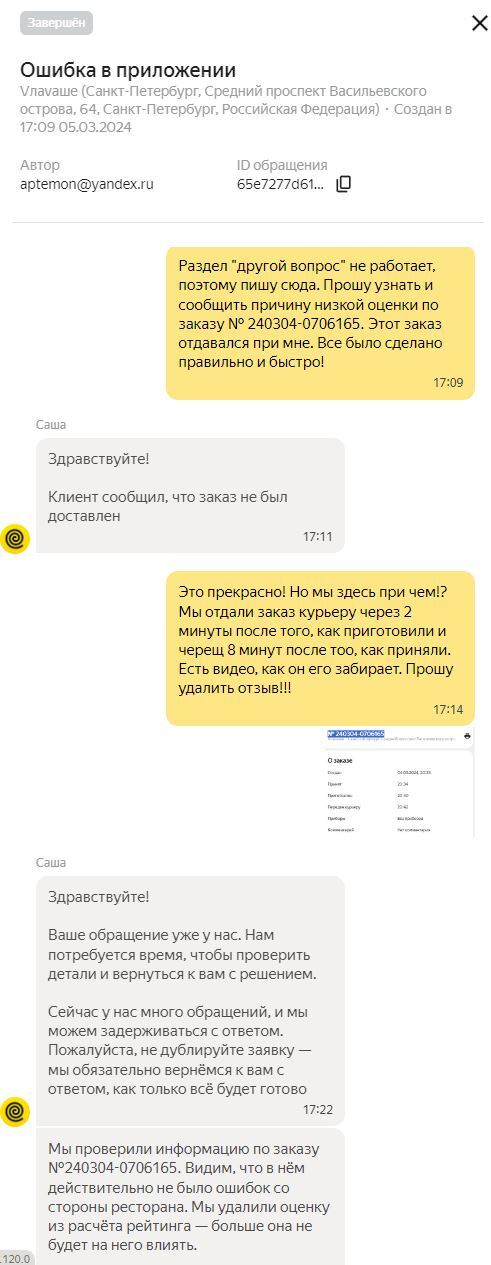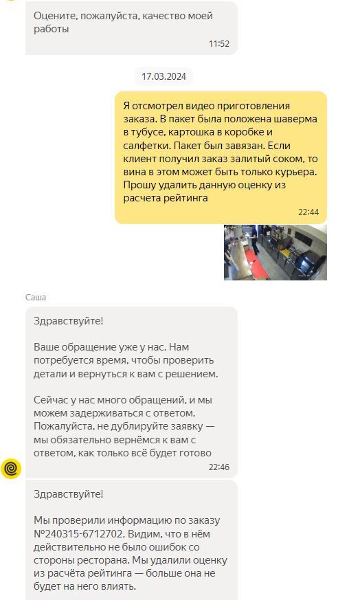 Пишу в поддержку, что есть видео, где заказ был передан курьеру из рук в руки, и прошу убрать оценку из рейтинга, так как нашей вины в сложившейся ситуации нет.