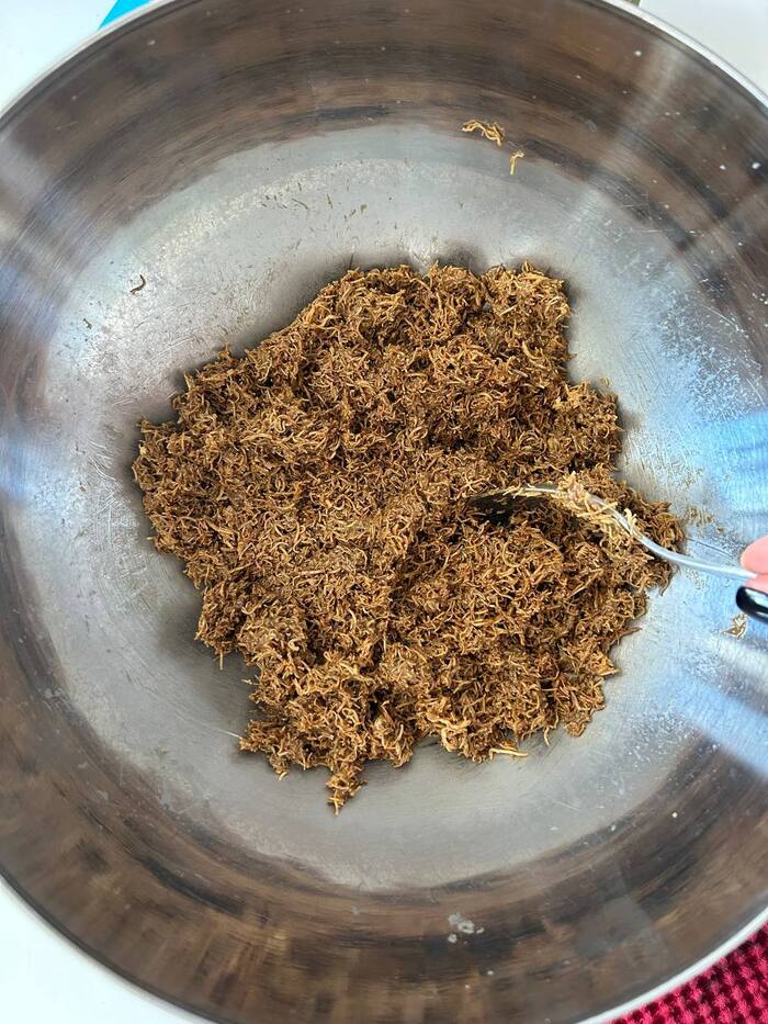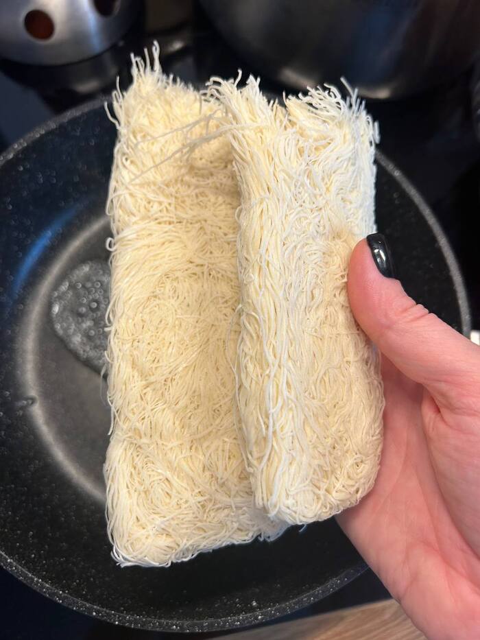 1. Начнем с катаифи. Беру это странное хрустящее тесто и нарезаю его. Мельче, мельче, оно ж потом в сковороде разлетится как надо!