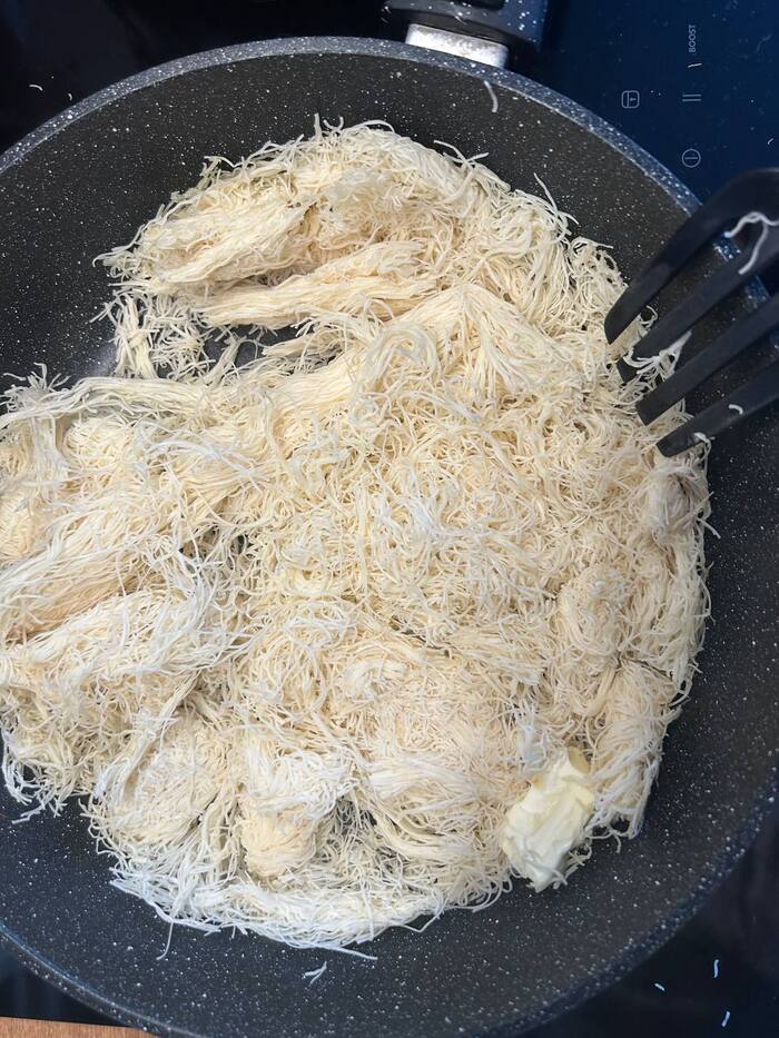 Жарим катаифи на сливочном масле. Бросаю в сковородку кусочек масла — и пусть оно тает, как мои мечты о диете. Теперь закидываю туда катаифи и обжариваю до золотистого цвета. Не увлекайся, не спали, следи глаз да глаз!