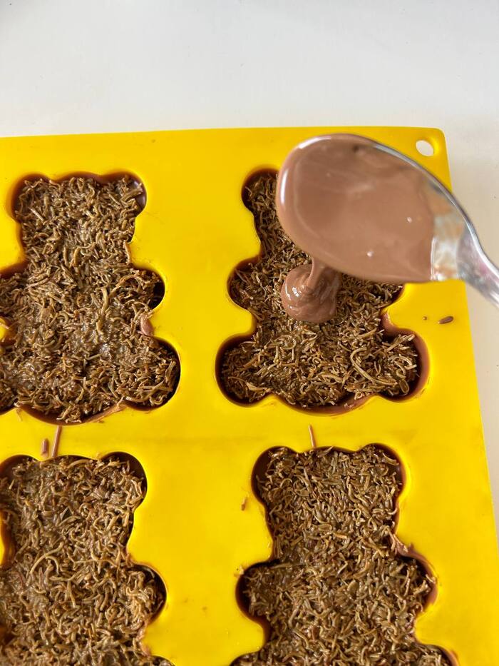 Финальный аккорд. Когда шоколад чуть застынет, аккуратненько выкладываю смесь фисташковой пасты с катаифи. Тщательно расправляю, представляя, что делаю идеальные слои в своей жизни.