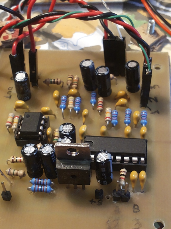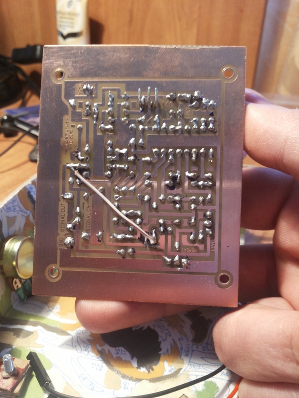 Печатную плату разводил самостоятельно в Sprint Layout, и как следствие - в нее закралась ошибка, которая на фотографии выше вылечена куском проволоки. Но печатку уже исправил и могу выслать желающим.