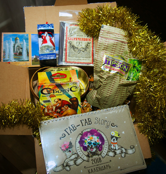 Новогодняя открытка с тёплыми пожеланиями, именное украшение на ёлку, обложка для паспорта в стиле книги Ницше (как тонко, @akilla73, я реально оценил!), чай с ароматом мандаринок (очень запашистый, супер!), настольная игра Свинтус (такой у меня ещё не было), кулёк конфет и календарь на 2018 год с приколюхами и собачками.