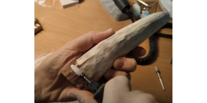 По правилам, с бивнем обязательно нужно что-то сделать, чтобы он сохранил свой изначальный вид. Обычно его стабилизируют. Этот процесс заключается в том, что заготовку под низким давлением пропитывают эпоксидной смолой, в результате чего она затекает во все микро щёлочки. Если же возможность стабилизировать отсутствует, бивень просто покрывают клеем ПВА. В обоих случаях цель состоит в том, чтобы предотвратить высыхание бивня, чтобы не случилось то, что случилось в итоге с переданным мне бивнем, но к сожалению, молодой человек обо всем этом не знал.