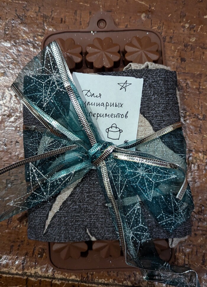 Стильное полотенце и, я так понимаю, формочки для конфет. Штош, значит, это знак, пришло время научиться темперировать шоколад. Сколько можно откладывать? @Alewow, вот и повод опробовать новый градусник)