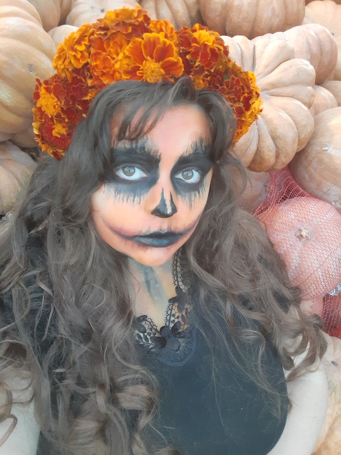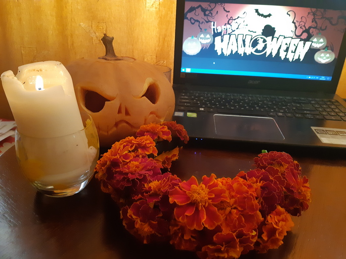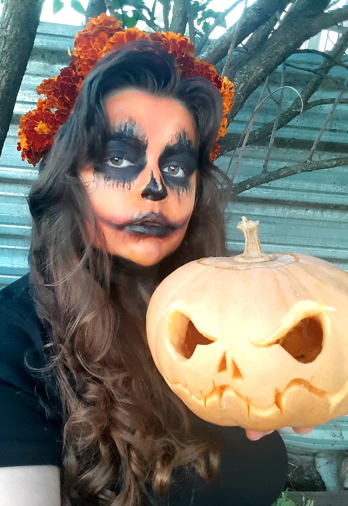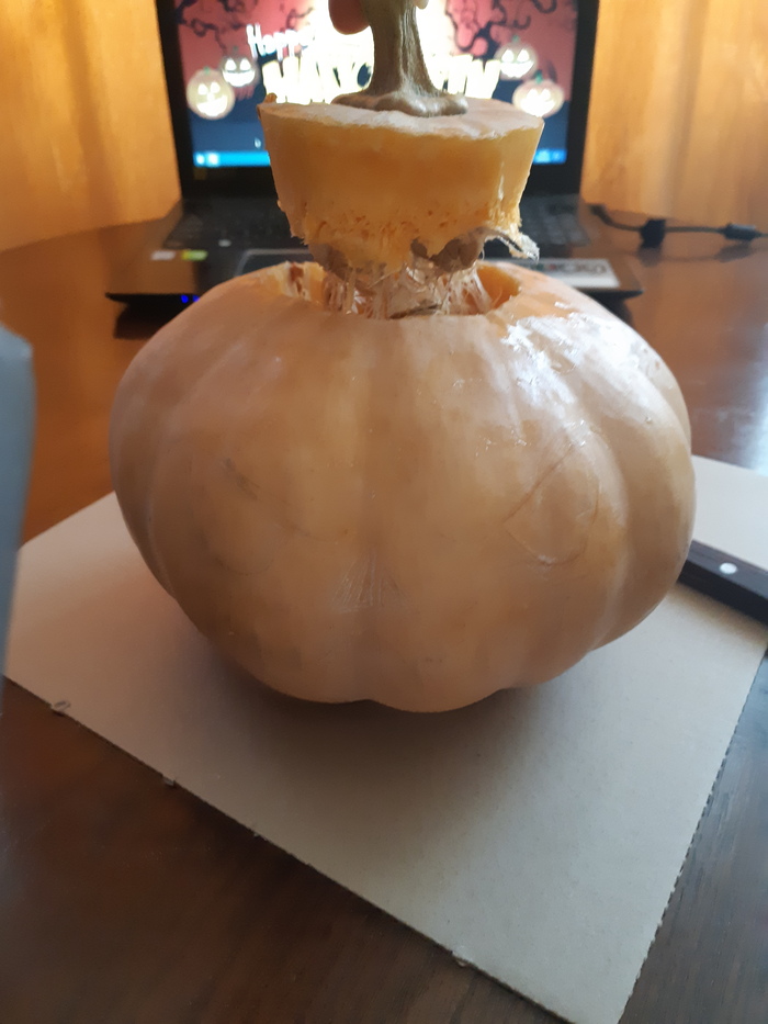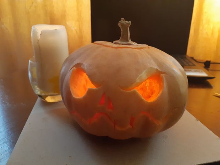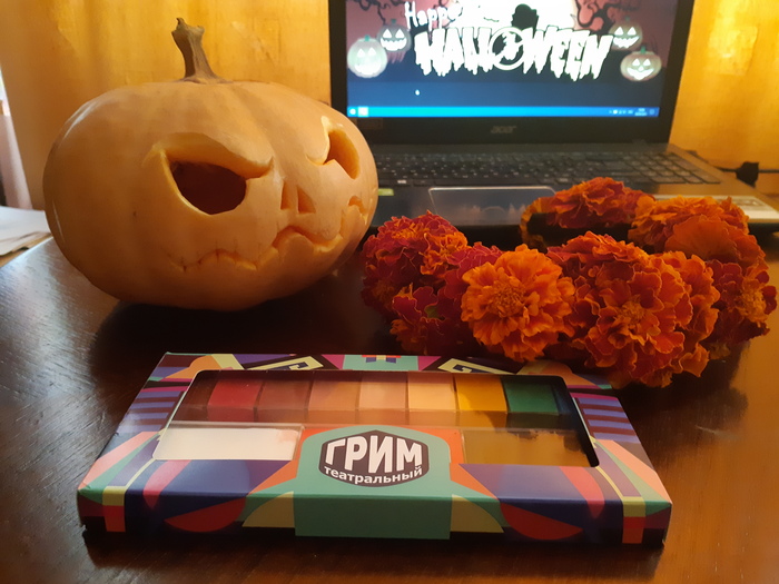 Было много идей из чего и как сделать Джека, почти остановилась на идее сделать в технике папье-маше. Но подумала, почему бы не сделать рожицу на морде человеческого лица. Также я ни разу не вырезала мордочки из тыковок, а хотелось попробовать, поэтому у нашего Джека из лица будет приемник Джек младший из тыковки.