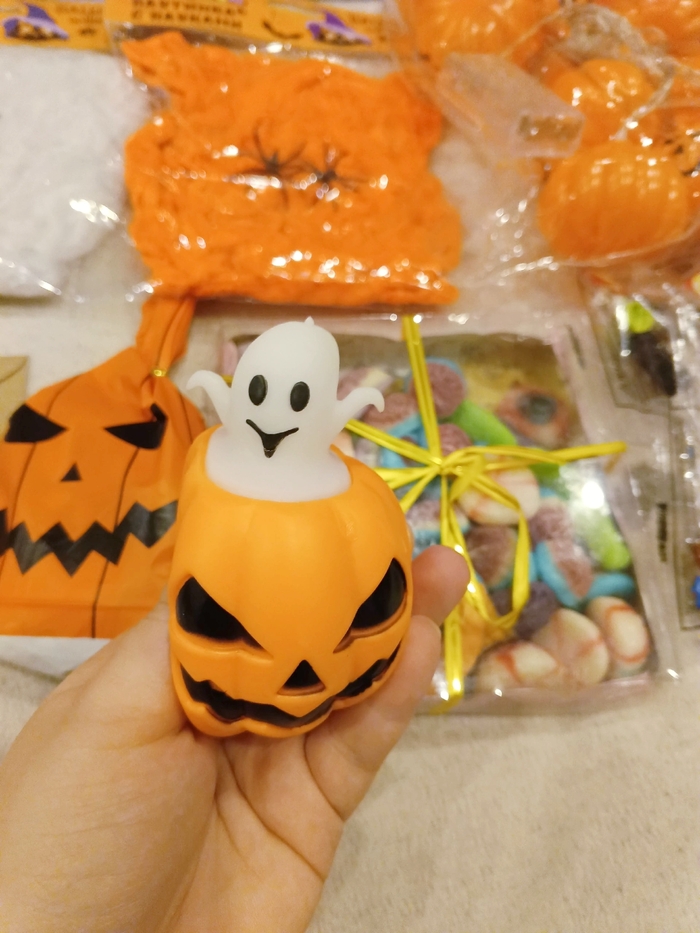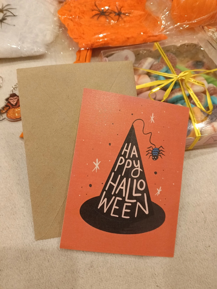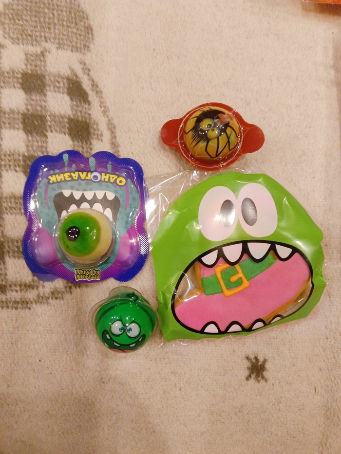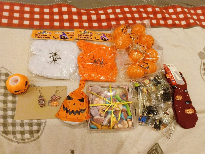 В наличии 2 вида паутины к Хеллоуину, игрушка антистресс, носочки с соответствующим принтом (из Спб, так сказать, вернулись на родину😁), но, правда, размер не мой, поэтому достанутся матушке. Очень ароматный, вкусный, свежий мармелад, необычный пакетик в виде тыквы, в котором тоже лежали сладости.