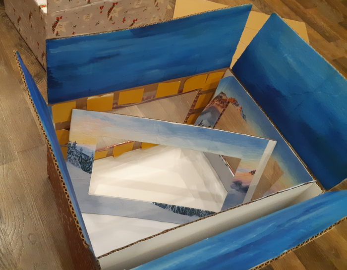 Основную коробку я сделала так, чтобы внутри был специальный кармашек под холст. Также у коробки были 2 окна. В качестве стекла был использован идеально прозрачный пластик, достаточно плотный и прочный.