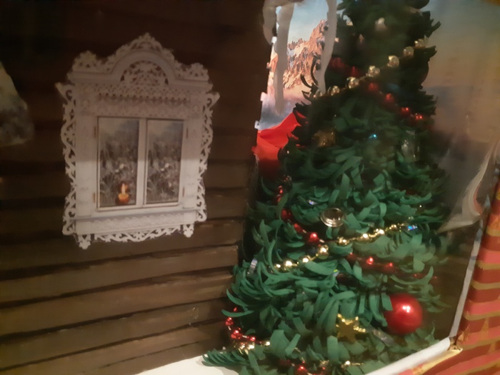 Квадратную коробку с предыдущей фотографии я обернула в упаковочную бумагу и сделала "подарок под елку". Елочка, домик и в упаковочной бумаге оформлен портрет.