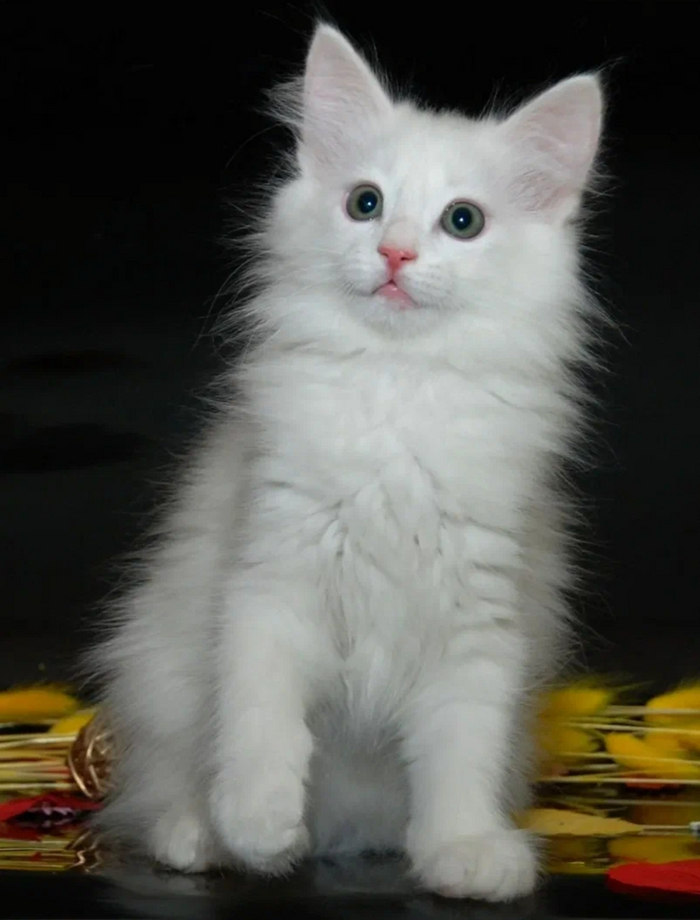 Беспородный котенок Кокосик. Также напоминающий турецкую ангору. Из особенностей - у него глаза разного цвета. Были оба голубые, а потом один позеленел. На фото этого еще не видно.