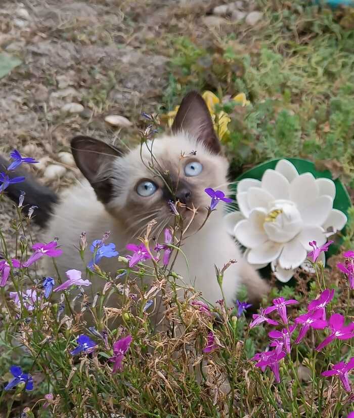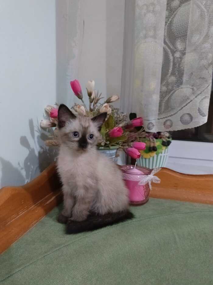 Беспородная кисонька Касандра. Родилась однотонным котенком почти белого цвета. С каждым днем постепенно темнел носик, лапки, хвост, ушки. Каким-то невероятным образом начала напоминать сиамскую кошку.