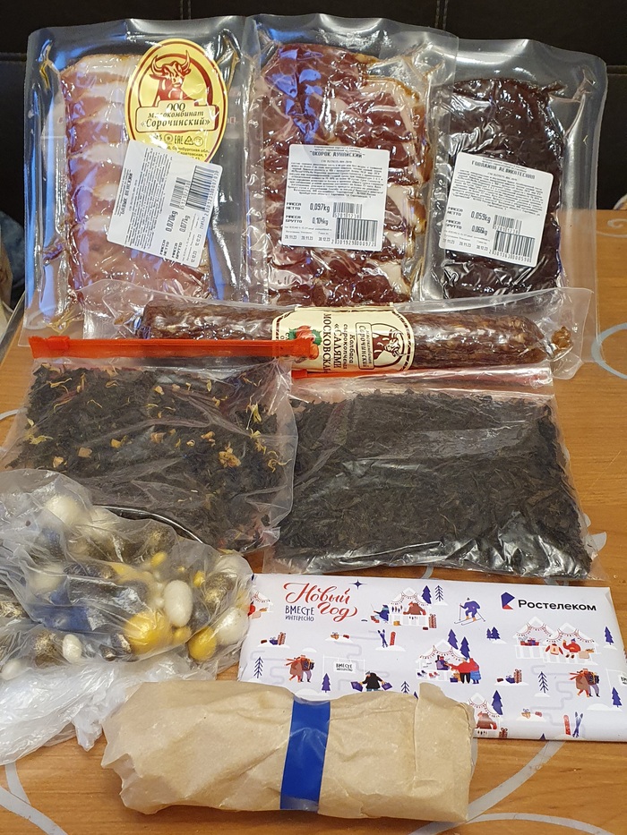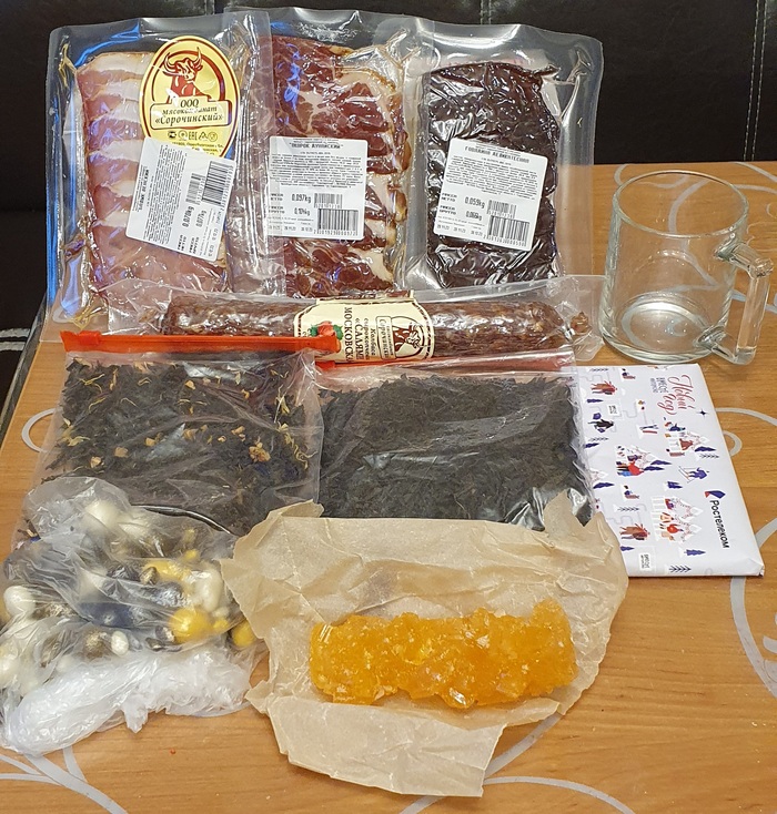 Там были нарезки, колбаса, чаёк, бокал к нему, орешки в шоколаде, сам шоколад и кое-что интригующее в бумажном свёртке!