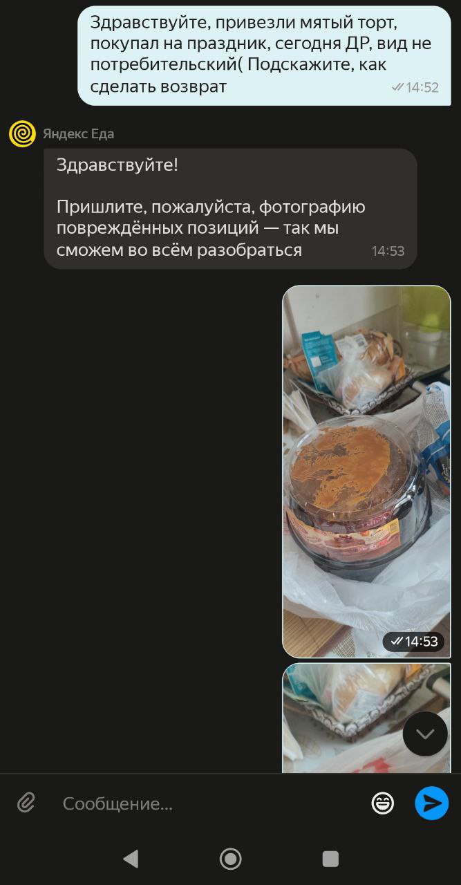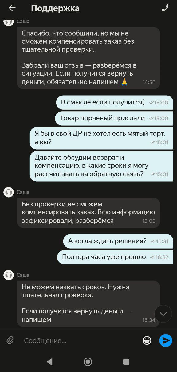 Лан бывает, курьер прошляпил. Пишу в поддержку Яндекс Еды - и начинается аттракцион. Оператор в чате пишет про "тщательную проверку" (не иначе как консилиум будут созывать по мятому торту), сроков обратной связи не называет и под офигевшую фразу "если получится вернуть деньги - напишем" исчезает на полтора часа.