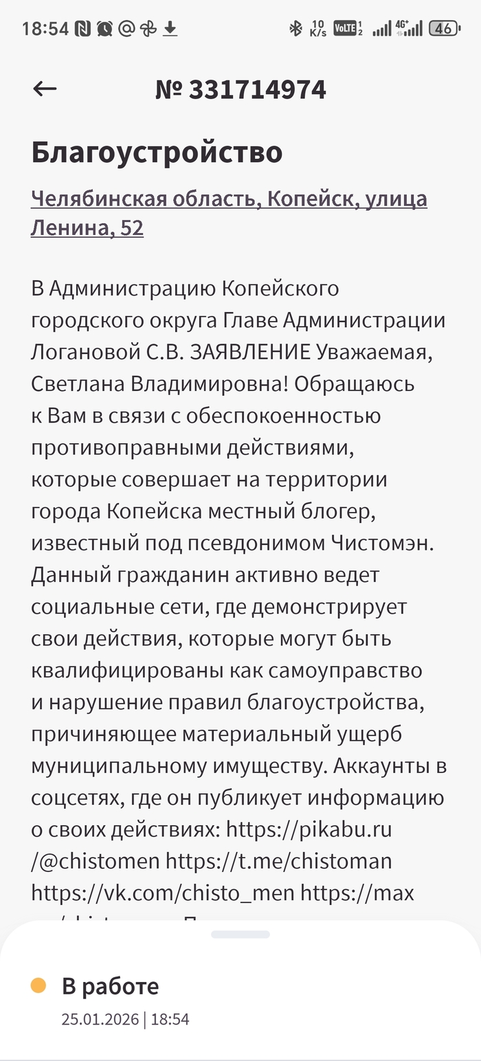 Продолжаю борьбу с самоуправством Чистомэна. Через платформу Решаем вместе отправил обращение с просьбой направить имеющиеся у администрации материалы по фактам самоуправства блогера в правоохранительные органы. В случае если сама администрация не предпримет таких мер, то буду лично писать заявление в следственный комитет.
