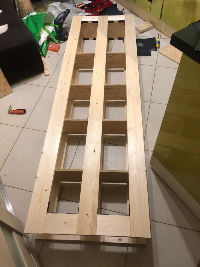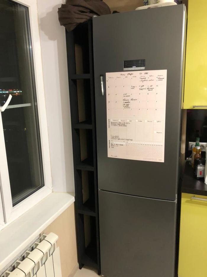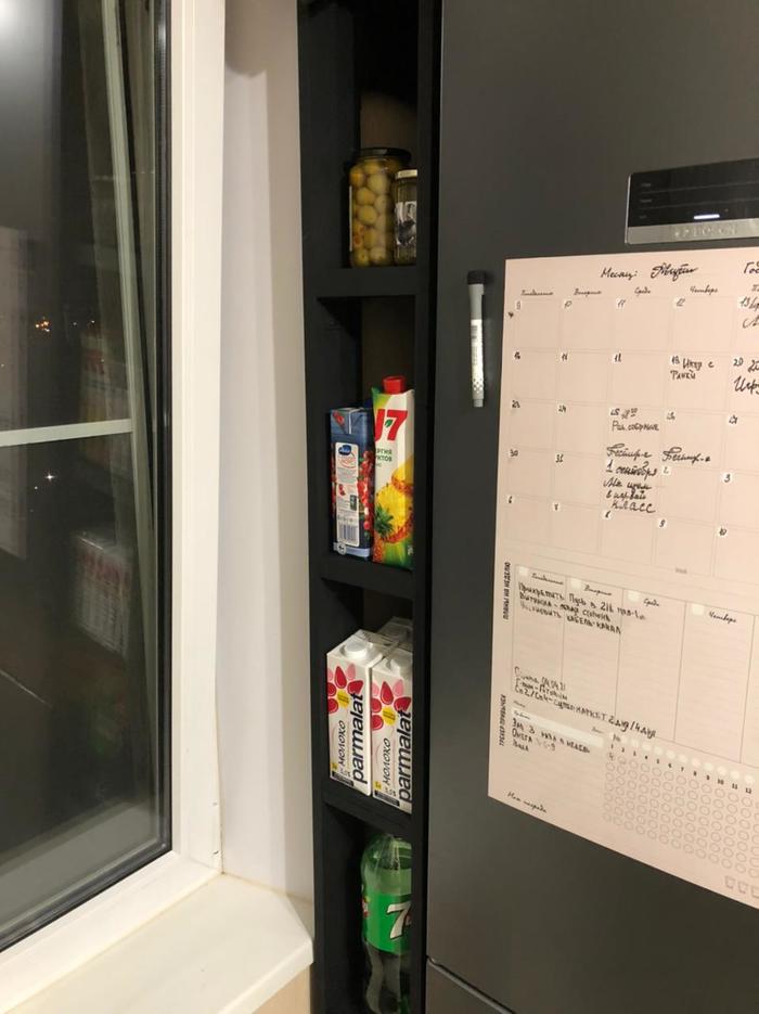 Не так давно, около месяца назад, с женой думали о том, как и где в типичной двухкомнатной квартире размещать товары длительного хранения. Ранее использовали верхние шкафы с горизонтальной дверцей для хранения молока, соков, кофе и других товаров, но объёмы шкафа не позволяли хранить товары хотя бы на месяц вперёд. Родилась идея осмотреть все подходящие места и приняли решение занять полость между холодильником и стеной(примерно 20см)