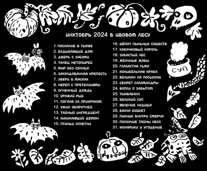 Для тех, кому лень ходить по ссылкам, рассказываю: в этом году я решила участвовать в инктобере не по официальным темам, а по списку от художницы под ником Ивовый лес. В этом посте темы 19 – 31 :)