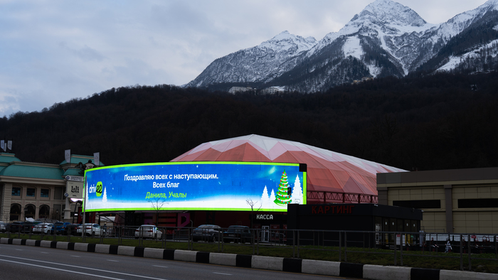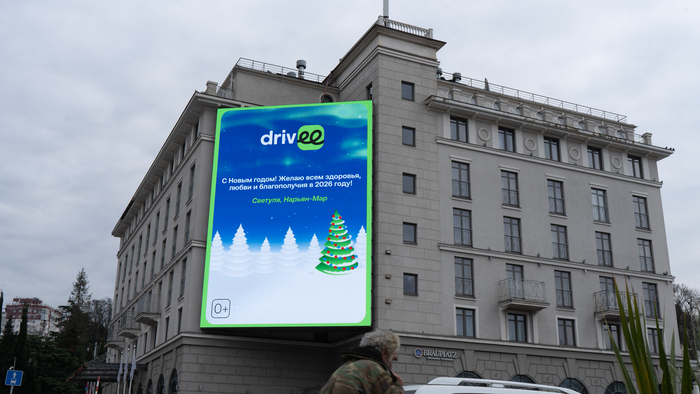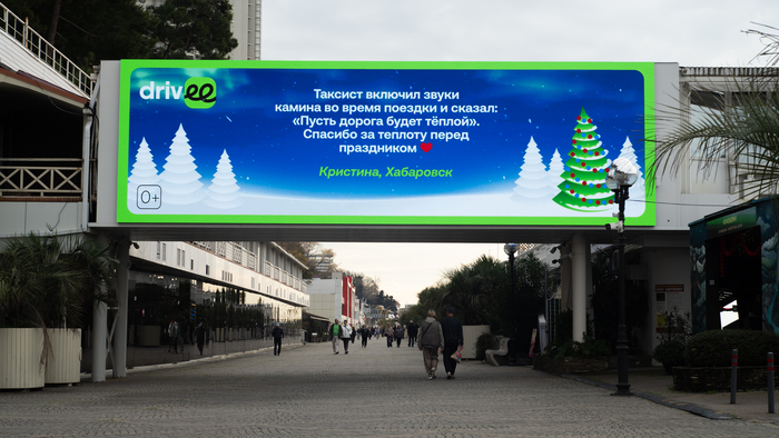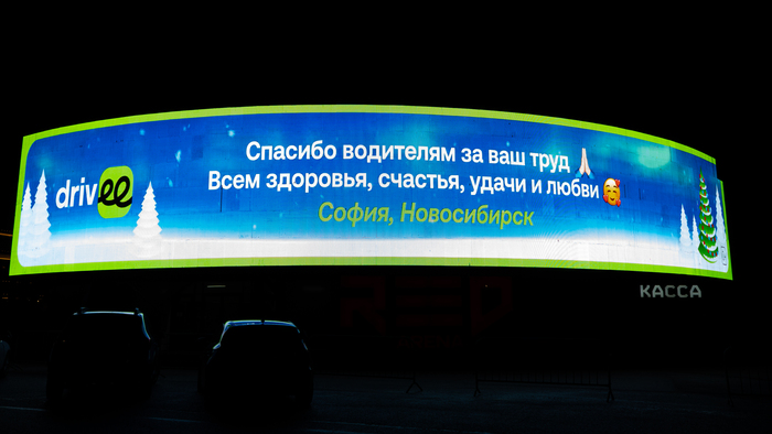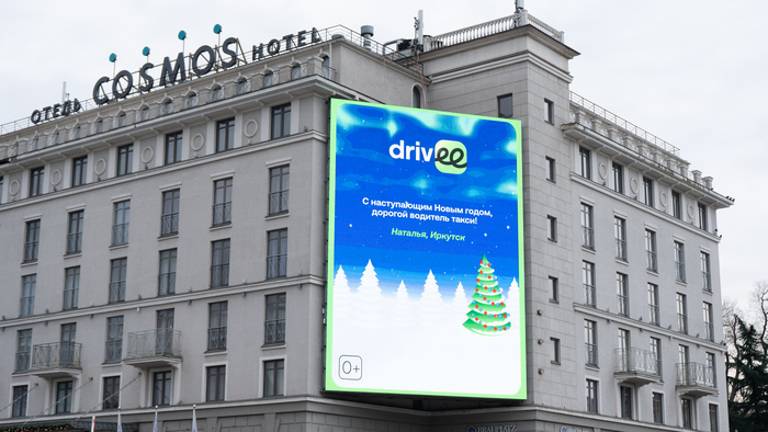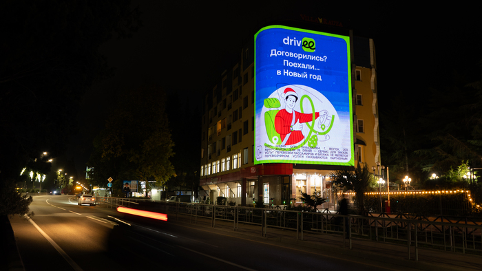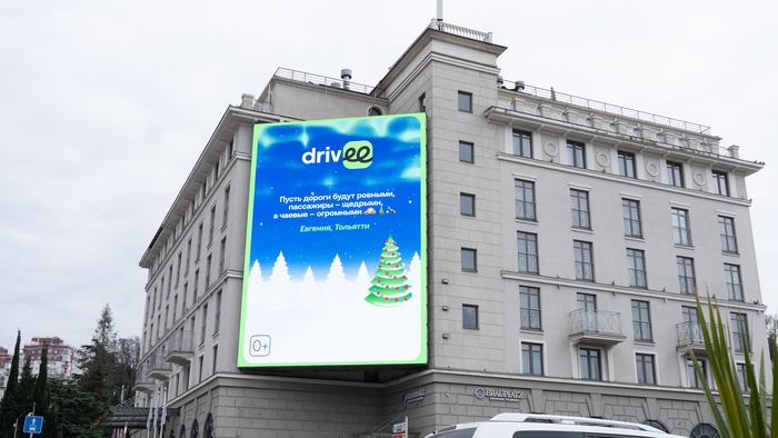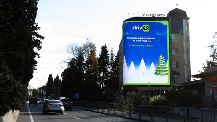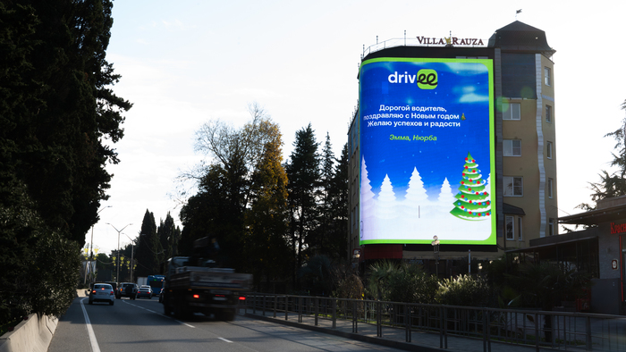 Стало быть, нагрузка на водителей возрастает в разы. Им не то, что праздник встретить, выдохнуть бывает некогда. И поэтому именно тут, в Сочи Drivee запустил 4 огромных медиафасада, куда целый день транслировались пожелания и благодарности водителям, присланные пассажирами.