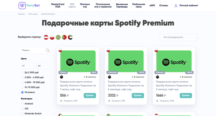 Пиплбот работает через официальный сайт. Это удобный, стабильный сервис, где можно быстро купить подписку Спотифай Премиум в формате подарочной карты. Пользователь выбирает срок подписки, регион, проходит оплату через безопасную платёжную систему и получает подтверждение.