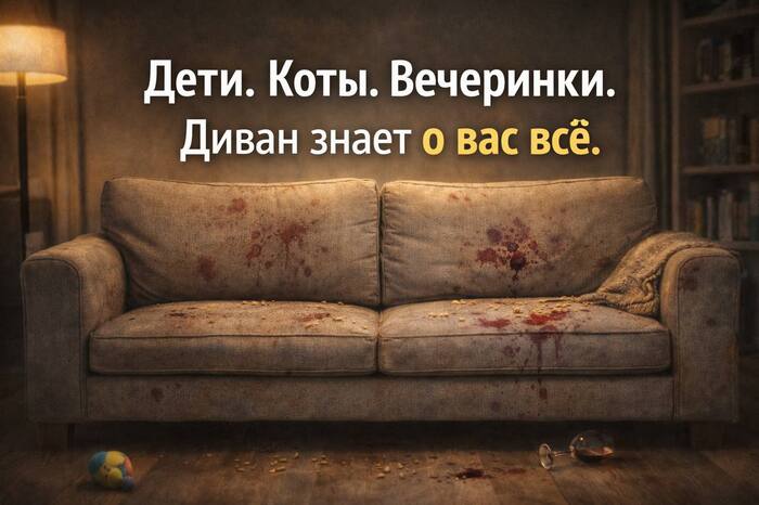 Диван грязнее унитаза — звучит как страшилка из интернета. Но если подумать, мы сидим на диване по несколько часов в день. Едим, спим, валяемся, дети строят на нём шалаши, коты и собаки считают его личной лежанкой. Унитаз при этом видит нас пару минут в день и регулярно моется. Давайте разберёмся и заодно проверим, что вообще можно сделать с мягкой мебелью, если не хочется вызывать клининг каждые пару месяцев.