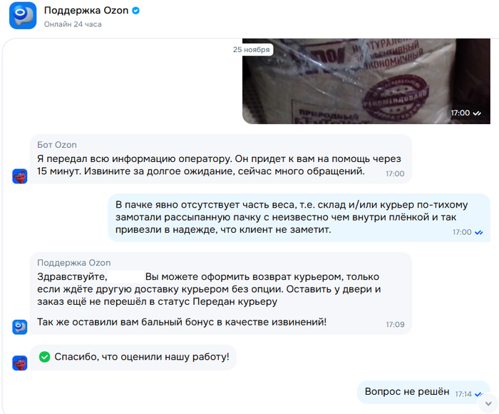 Заказал несколько мешков наполнителя шерстяным курьерской доставкой от @Ozon, привезли повреждённый товар, курьер тихонько запихнул один повреждённый мешок из четырёх за остальные и быстро побежал к лифту, закрывая заказ. Когда я заметил и его окликнул, он начал лопотать, что уже закрыл заказ, очень торопится на следующий, а товар ему "такой на складе отгрузили". И теперь можно только оформлять возврат, т.к. заявку он уже закрыл. Мешок замотан плёнкой, по весу - явно легче других, т.е. эти содомиты взяли слегка рассыпанный мешок, кое-как замотали, и хорошо если ничего внутрь не досыпали "для весу". Рубрика "твори бардак, мы здесь проездом" как она есть.