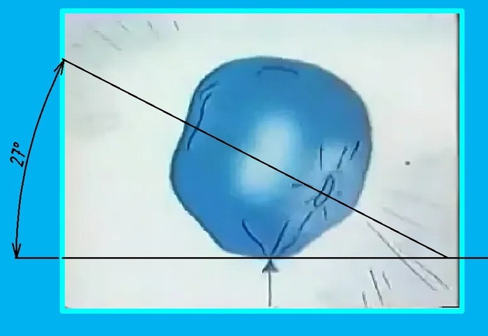 Угол пробития шарика - 27 градусов, шарик пробит с нижнего правого угла снизу вверх по линии циферблата с 4 до 10 часов.