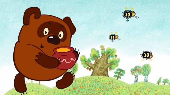 Винни и Пятачок подходят к дубу, происходит запуск Винни к точке с медом, пчелы атакуют Винни, миссия проваливается....попытка отвлечь пчел, отвлекающий маневр с зонтиком и дождем .Поняв что фокус с зонтиком не прокатывает и нужно срочно спасти Винни , Пятачок после крика Винни сбегав за ружьём делает важные вещи:
