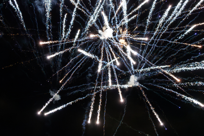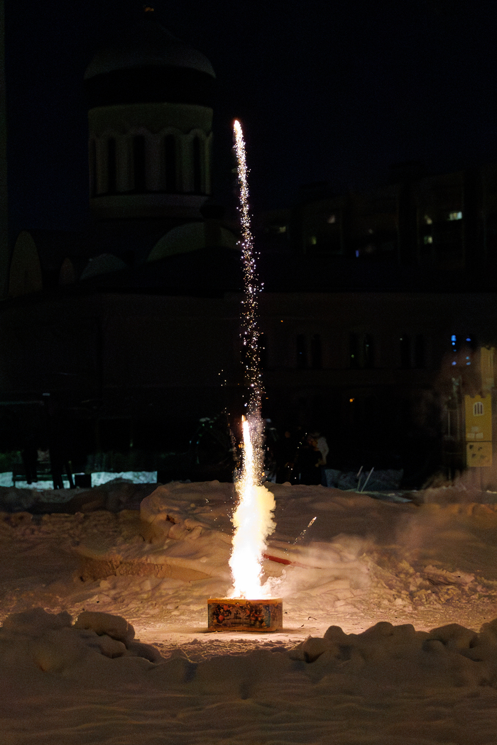 Фейерверк типа "банка в снегу", на стоп-кадрах видны интересные спецэффекты тонких шлейфов