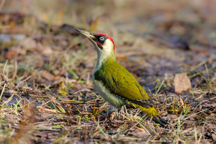 Зеленый дятел. Веселый птиц, который часто опускается на землю в поисках еды.