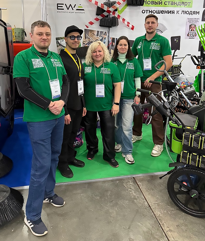 К часу дня добрался до «Крокус Экспо». Меня встретила Алёна и провела через огромные залы к стенду краснодарцев. Пока шли, она успела рассказать, что выставка посвящена технологиям для уборки, но для улицы там почти ничего нет. Всё пространство отдано под блестящий клининговый мир торговых центров и промышленных помещений. Оно и понятно: в торговом центре убираться проще, чем на улице, где асфальт норовит подставить подножку, погода вредничает, и прохожие лезут под метлу.