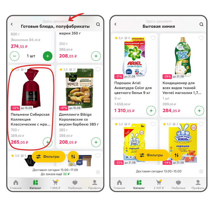 Для примера заскринила вам экономию на пельменях в этом разделе — она составила 124 ₽. На первый взгляд кажется, что это немного, но если посчитать в совокупности, то в месяц выходит больше 1 000 ₽ только за счёт этого раздела.