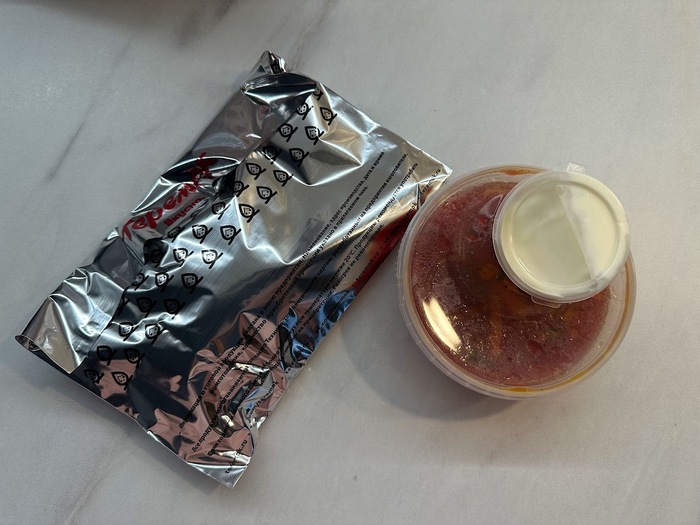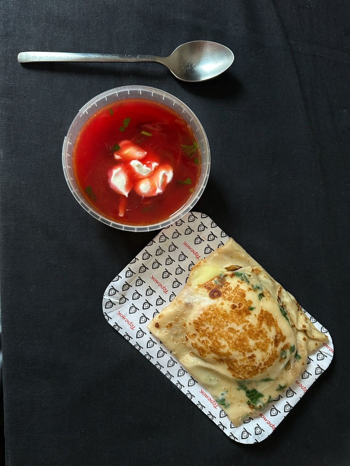Всё горячее и максимально свежее, даже греть не надо. Для блинчика это особенно важно — я пробовал его и у них в кафе — вообще не отличается от доставки, так же вкусно. Суп тоже в надёжной таре, шанса пролиться у него не было) Сметана — в отдельном мини-контейнере.