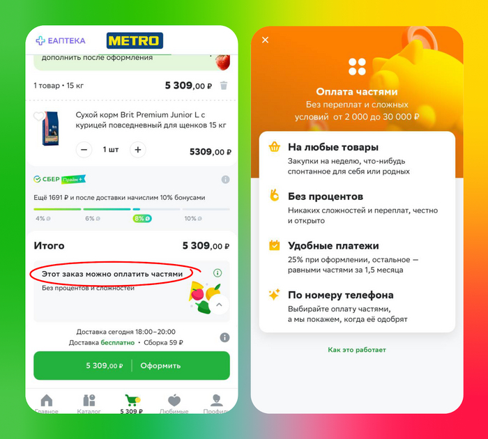 Накануне праздников всегда уходят крупные суммы на хорошие подарки и вкусный стол. Но со СберМаркетом оплату заказов от 2 000 ₽ до 30 000 ₽ легко разбить на равные части.