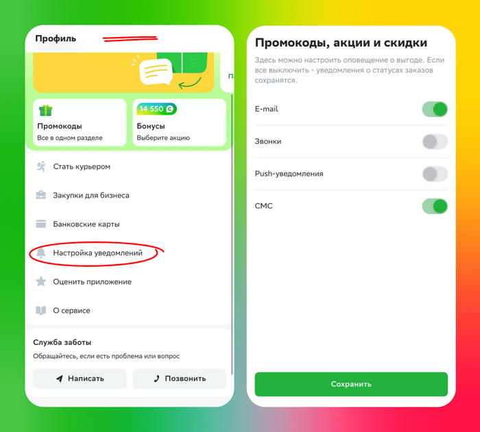 Для этого просто нажмите на иконку профиля в нижнем правом углу меню и перейдите в «Настройку уведомлений». СМС, email-рассылка или даже звонки — выбирайте, что вам комфортнее. А можете отключить их все.Переводите зелёный кружок вправо, если способ вам подходит, и влево, если нет.