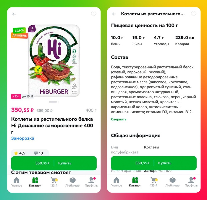Если пробуете что-то впервые или не уверены в составе, проскролльте вниз и посмотрите, из чего сделан продукт. К примеру, вот решили попробовать вегетарианскую еду и задумались: а что это за котлеты такие без мяса? Читаете — и, если зожный скептик внутри вас не против, смело заказываете и готовите вкусный ужин.