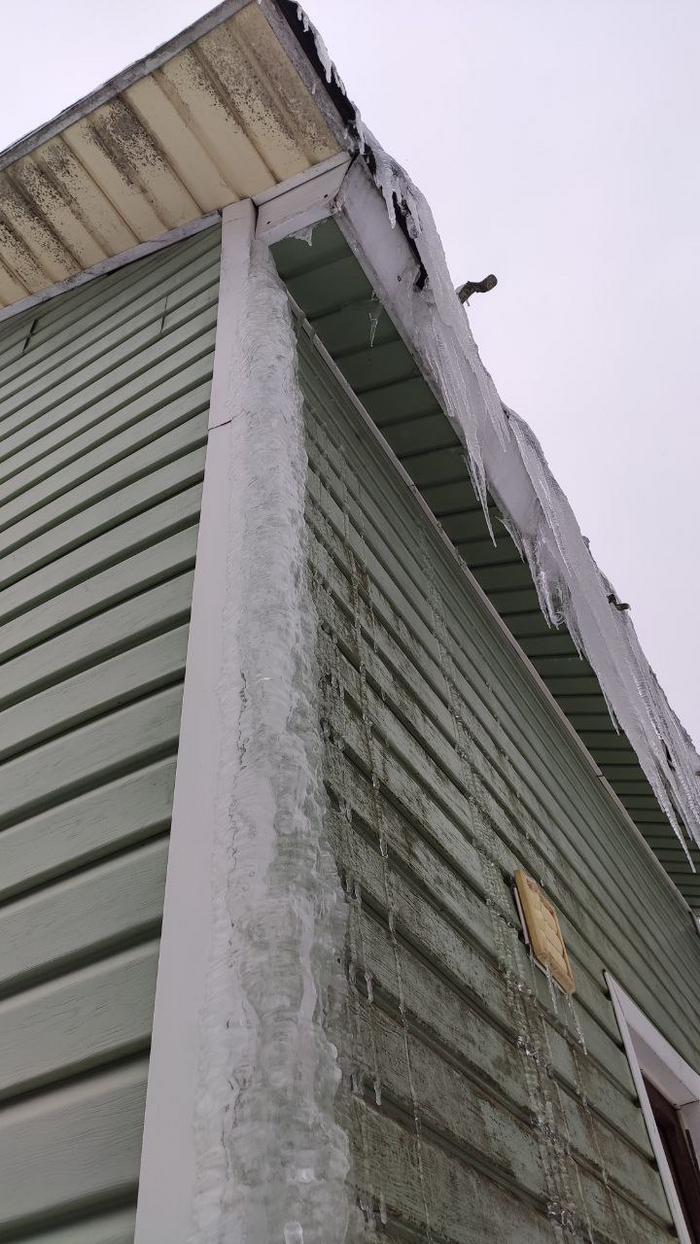 Предположительно из-за этого вода стала течь уже непосредственно по сайдингу, превращаясь в подобные стоячие сосульки: