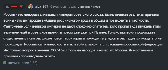 Тут покачали, там покачали, подожгли несколько конфликтов вдоль границ - и вот уже какой-нибудь регион резко вспомнил, что они ващет самостоятельный народ, с Россией не связанный, возжелал независимости, свободы, демократии, кружевных трусиков. А тут, по счастливому совпадению, через туман приграничной войны именно в этот регион непонятным образом уже привезли оружие, провокаторов, специалистов, печенье, хорошее настроение, друзей и лидеров общественного мнения. Счастливые соичи с упоением скачут с ни на что не похожими кричалками, строят баррикады из электросамокатов и с упоением делают селфи на фоне разбитых окон какой-нибудь местной администрации. Западные СМИ взрываются восторженными статьями и "спонтанном всплеске прав и свобод", очередной Тихановский отечественного разлива кривляется на фоне заряженной толпы, через границу едут грузовики внутри которых прекрасная Россия будущего, но это не точно.