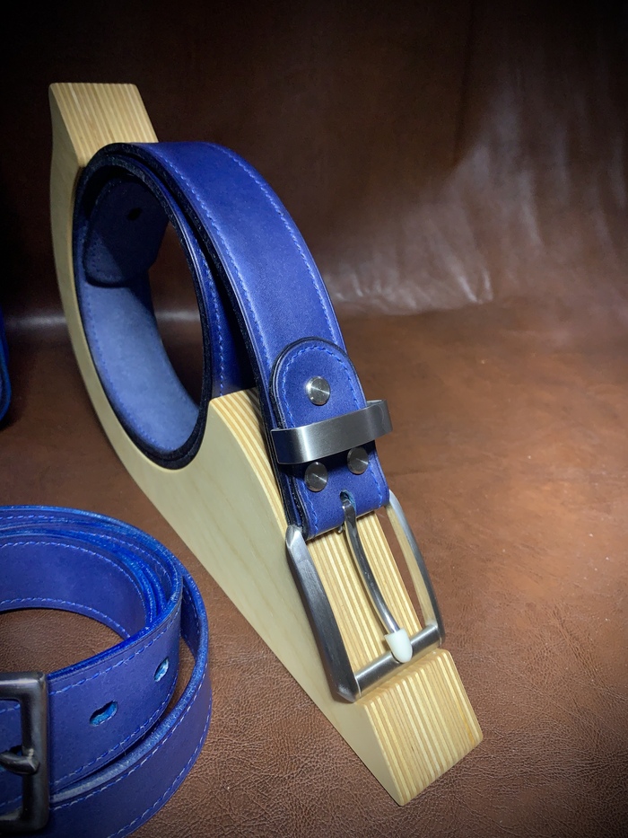 Ремни однослойные 40мм/4,5-5мм из хребтовой части кожи. Слоновая кость и нержавеющая сталь, индиго и нержавеющая сталь, обожженное дерево и латунь. Ручной окрас, обработка, шов. Последний мой самый любимый, даж отдавать не хотел.