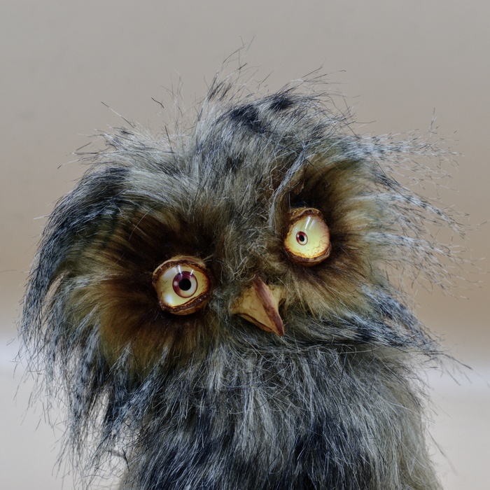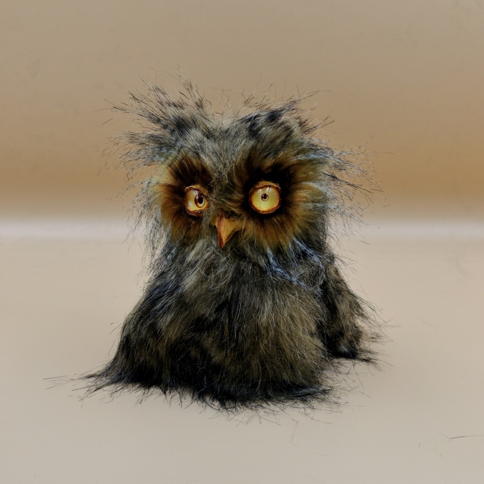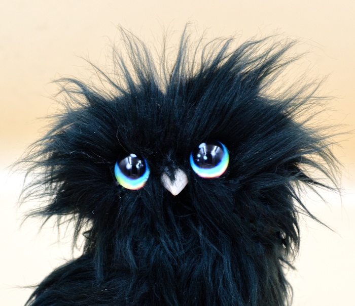 Рост 18 см, сшит из мягкого кудрявого эко-меха. Глаза авторского дизайна, ловят каждый лучик света. Голова и крылья с лапами подвижные.