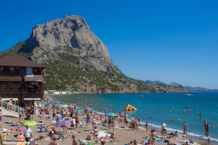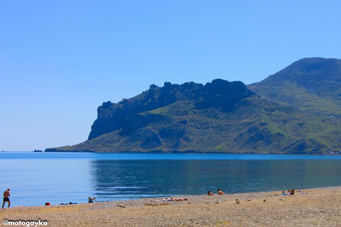 Пляж в Коктебеле на фоне древнего потухшего вулкана Кара-Даг.