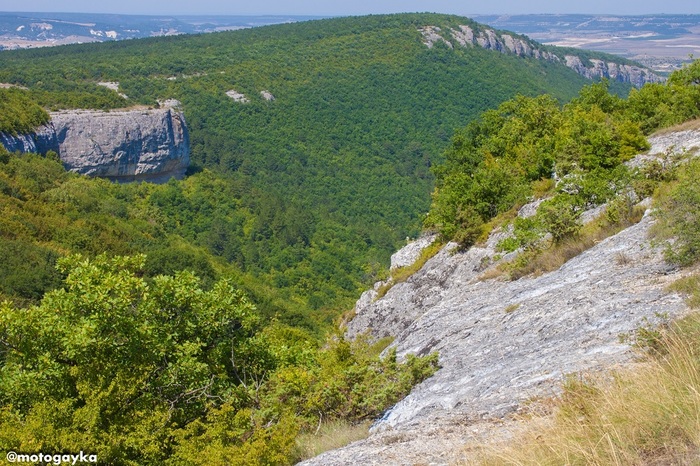 А это вид на Качинский каньон, открывающийся с площадки у Бисерного храма - скита Св. Анастасии. О самом храме я расскажу в отдельном посте. Подняться на площадку можно как пешком с трассы от села Предущельное (подъем крутоват, но проходит в тени деревьев), так и на авто, проехав через сам поселок и поднявшись на плато. Место пока не заезженное и не затоптанное, весьма умиротворенное и, конечно, красивое.