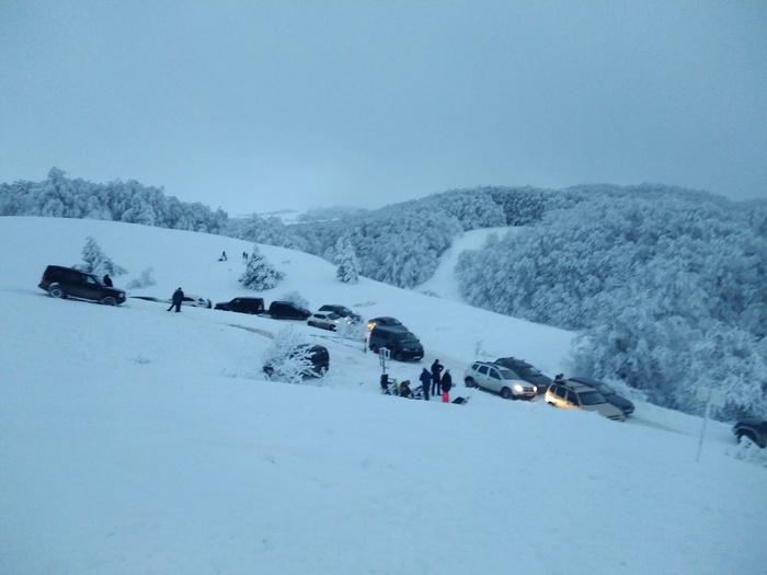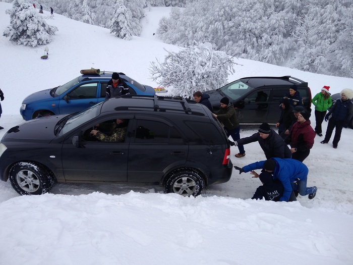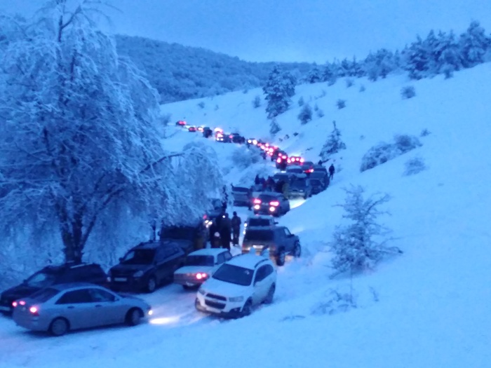 А теперь по существу: мы поехали на трех полноприводных авто на зимней резине с цепями. В багажниках тросы, запасы кипятка и бутеров из расчёта - а вдруг что. Я не хвастаюсь, но количество людей, рвущихся в горы зимой не подготовленными, на пузотерках, собирающие все колеи, мило буксующие на летней резине и на ней же совершающие тройные батманы, умилилило. А больше всего умилило, что практически в каждой машине такого водителя сидел ребёнок. Товарищи, о чем вы думаете? Горы не прощают ошибок, так же как гололед!!! И, конечно же, восхитительная реакция Мчс и ГИБДД, которым ТС таки дозвонилась. Внятного ответа, кто будет разрулировать эту восхитительную пробку в обе стороны - я не получила. Кстати, на плато присутствовали ребята из Крым-спаса, 'в компетенцию которых не входит регулировать движение'. Что входит в их компетенцию вообще непонятно. Ребята просто стояли и смотрели. Поэтому разворачивали авто простые граждане, эти же граждане на поворотах при спуске собственноручно саперными лопатками вгрызались в снег до почвы, чтобы посыпать гололед и как кирками сбивали пласты льда с дороги. Кучек с песком или тырсой для посыпки не было нигде. Экипаж Мчс на двух Патриотах мы встретили уже около 20.00 на спуске в Соколинное, и что привезли ребята... А ничего:) А внизу при подъёме уже стоял экипаж Дпс, где-то в 17 часов перекрывший движение наверх. По словам товарищей в погонах за последние годы было оч много жалоб на то, что на плато не пускали все подряд машины, а только полный привод. Вот, дескать, и решили в этом году пост не ставить. Пост не ставить, песок не сыпать - вот это по-нашему! :) Пока петух не клюнет в жопу. Словно забыли, что народ у нас простой - видит цель и не видит препятствий))