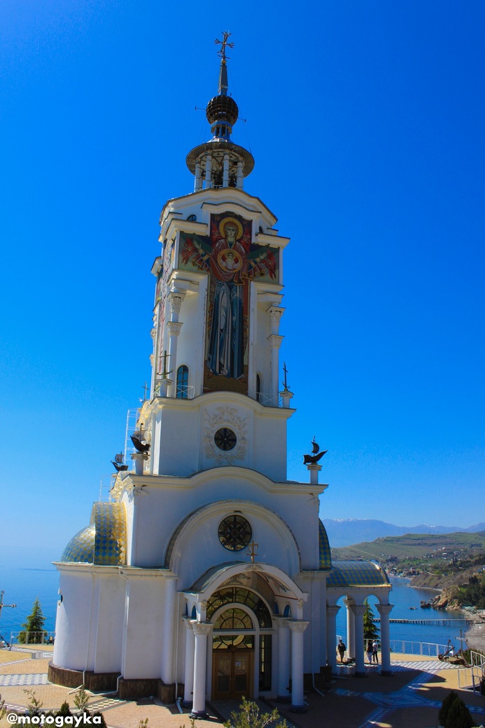 Воскресенская церковь в Форосе - одно из самых посещаемых мест в Крыму. Утверждают, что запись на венчание/крещение в этом месте расписана на пару месяцев вперед. И понятно почему - церковь расположена на скальном обрыве на высоте 412 метров над трассой Ялта-Севастополь. Ближайший населенный пункт - п. Форос, но до него еще нужно добраться - 5 км по шоссе (правда асфальтированному) но с очень крутыми поворотами. Вокруг только лес, горы, а на горизонте синее-синее море.