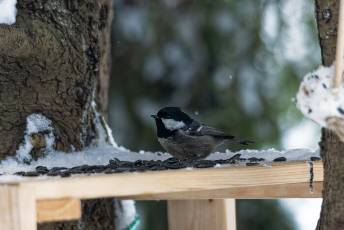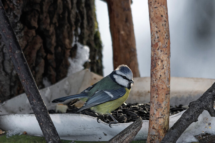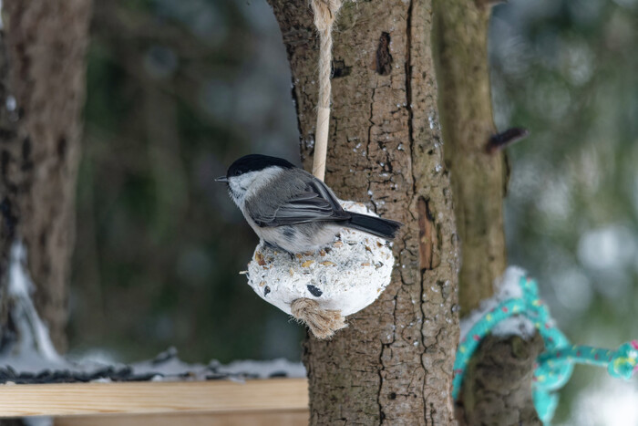 После нового года навалило снега. В лесу не протолкнуться от лыжников. А птички наоборот попрятались от непогоды. Повесил новую кормушку взамен пришедшей в негодность. Подсыпал еды. Проверил как зашли жировые шарики с зерносмесью. 2 шара расклеваны наполовину. Повесил ещё три. Заметил только снегирей и чечеток. Лазоревки и большаки не считаются.