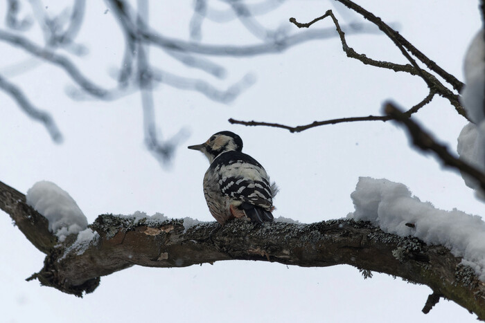 У нас ночью опять навалило снега, даже смс от мчс пришло. Поэтому я набрал семечек и преодолевая сугробы потопал в сторону леса. Смог пройти примерно половину маршрута. Набрал снега в валенки, но по основным кормушкам еду рассыпал. Пока возле одного дерева вытряхивал снег из валенка кто-то попытался уконтропупить желну. Но я не смог нормально рассмотреть нападавшего. Точно не сова. Может тетеревятник? Хз короче.