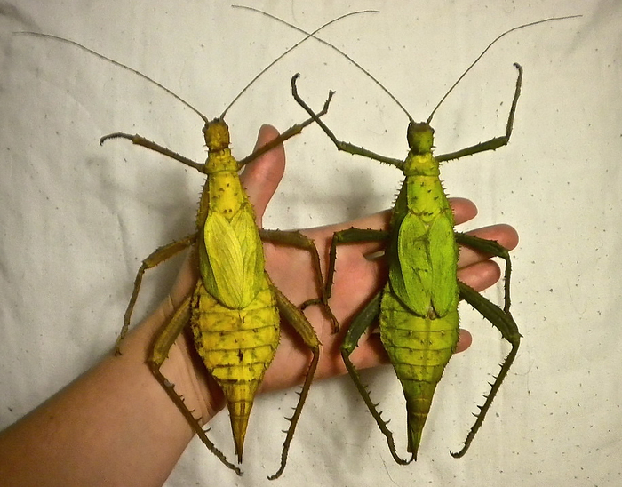 Самки и самцы у этого вида настолько сильно отличаются внешне, что сразу бывает трудно признать в них представителей одного и того же вида. Массивная зелёная тушка на фото – самка. Габариты дам у этих палочников просто поразительны: длиной они достигают 17 см (и это ещё не считая усиков), а весом – колоссальных 65 граммов, что делает их одними из самых тяжёлых ныне живущих насекомых. Самцы с их длиной от 9 до 13 см по сравнению с самками кажутся куда как более изящными, хотя в ряду других насекомых всё равно те ещё великаны.